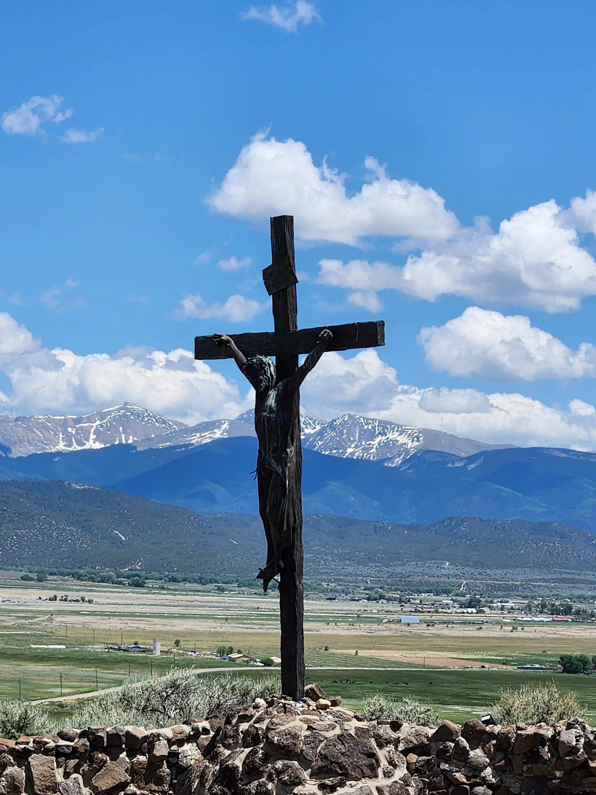 Karl and Bonnie took me for an afternoon ride out to the oldest continuously inhabited city in Colorado: San Luis, which dates back to a land grant given by the Spanish king. There is a little chapel on the mesa (flat top) of a hill just off the main street through San Louis, population 600 or so. A winding trail goes up the face of the hill and takes you through the 15 stations of the cross. When you get to the top there are walking trails that lead past maybe 15 or so statues of the saints, including some of the Spanish Catholic priests who helped found the city. We prayed the stations of the cross on our way up, and then in the chapel we prayed as well, including a regular set of prayers I’ve been saying for Pam every chance I get. It was a beautiful and deeply moving moment. I was, per usual, quite broken down. I suspect I will always feel like a beginner when it comes to learning how to live without Pam. Karl and Bonnie surprised me then when they asked if they could lay hands on me to pray. Yes. What a loving gesture. We sat in their family room for dinner that night and I introduced them to The Chosen series, a portrayal of Jesus that always reminds me that the Lord wants me not only to place my trust in him but also to love him, and to walk in his way.